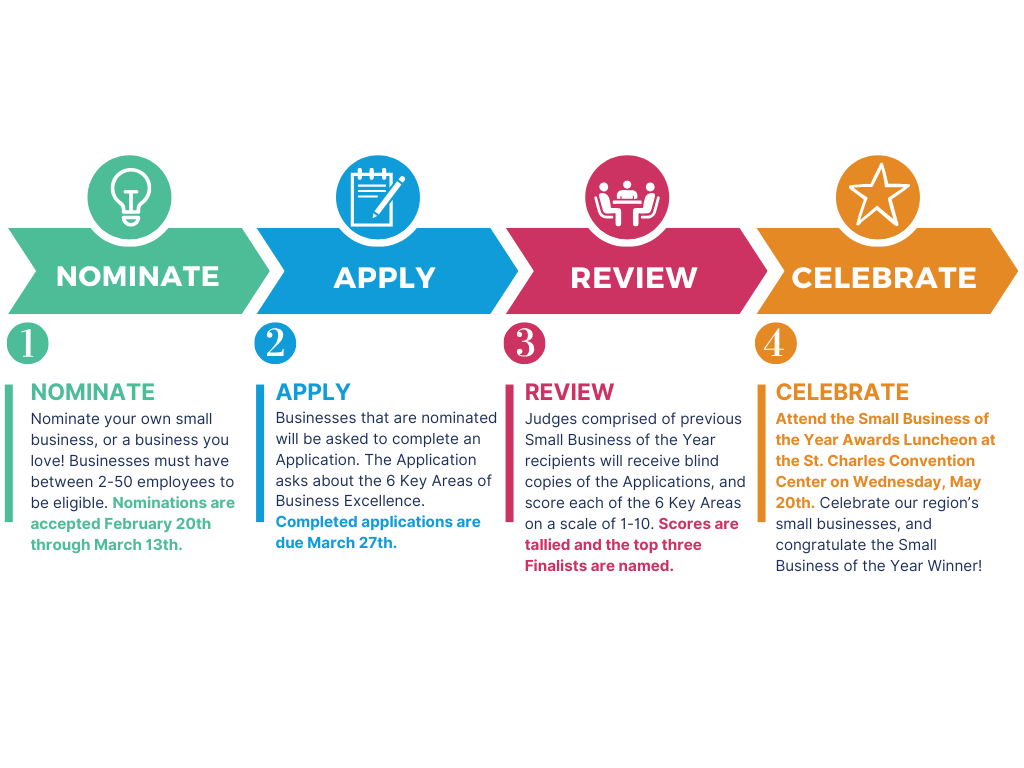 The 2026 Small Business of the Year Awards Luncheon will be held on Wednesday, May 20 from 11:00am - 1:00pm at the St. Charles Convention Center.